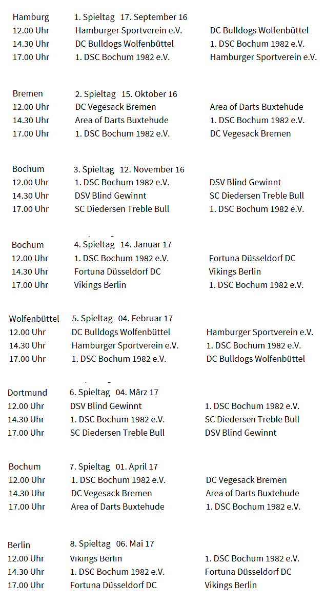 Hier die Spielpläne unserer drei Teams für die anstehende Saison 2016/2017. Die Erste beginnt mit dem 1. Doppelspieltag am 17. September 2016 in der Dart-Bundesliga auswärts in Hamburg gegen die Bulldogs Wolfenbüttel (14.30 Uhr) und gegen den Hamburger SV (17.00 Uhr). Team 2 startet am 1. Spieltag der 1. Dartliga NRW bereits am 3. September 2016 um 20.00 Uhr zuhause gegen Doppel 1 Dinslaken (1). Team 3 hat am 1. Spieltag in der Bezirksklasse Westfalen-Süd (1) ebenfalls am 3. September